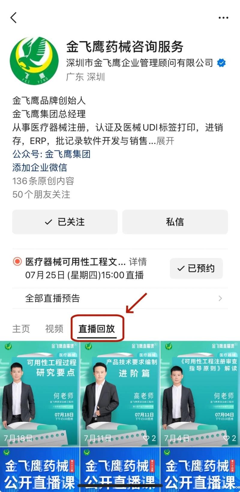 往期直播培训课程支持回放,关注“betway必威西盟体育官网入口药械咨询服务”视频号并点击视频号主页,即可查看“直播回放”哦~