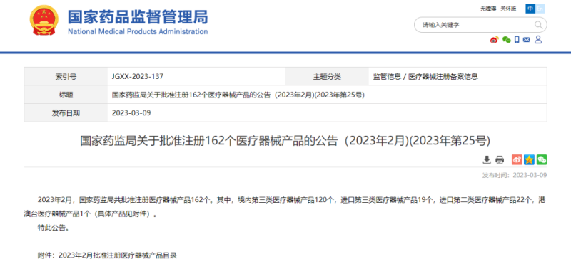 据国家药监局官网最新公告,2023年2月,国家药监局共批准注册医疗器械产品162个。其中,境内第三类医疗器械产品120个,进口第三类医疗器械产品19个,进口第二类医疗器械产品22个,港澳台医疗器械产品1个(具体产品见附件)。