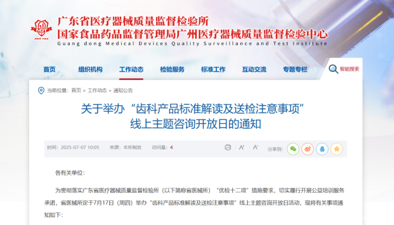 7月7日,广东省医疗器械质量监督检验所官网发布通知称,定于7月17日(周四)举办“齿科产品标准解读及送检注意事项”线上主题咨询开放日活动,具体时间及参会方式如下:
